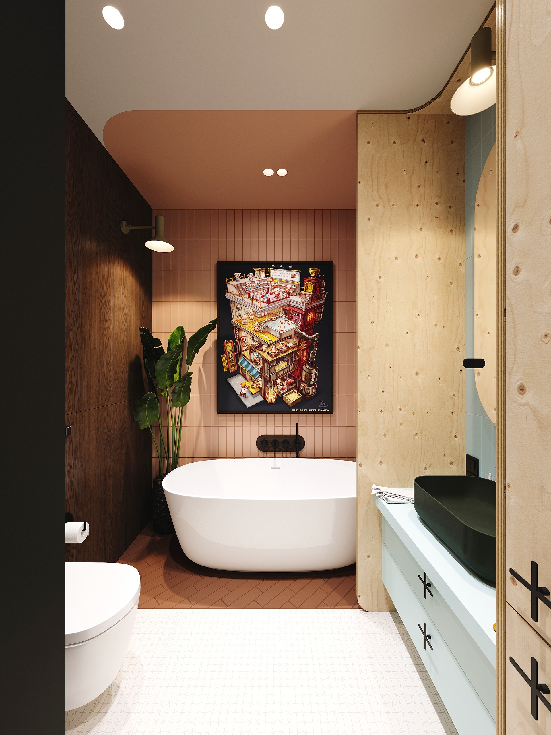 Odważne zestawienia kolorystyczne w swobodnych formach i kształtach połączone z mnogością precyzyjnie zaprojektowanych detali zmieniają zupełnie odbiór brył z ciemnego drewna, nawiązujących do lat 60 zaobleń i i kamiennych blatów. Sypialnie zaprojektowane zostały w podobnym duchu i stanowią pewnego rodzaju festiwal form i barw, jednak w bardzo geometrycznym i stylistycznym reżimie kreując tym samym super klimat orzeźwiającej stylistycznej balangi.