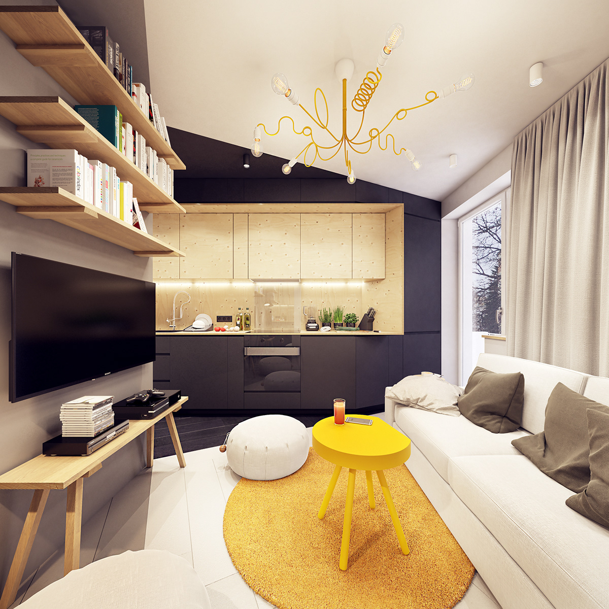 The project involved a thorough redesign of the walls to make the most of the living space and maneuver around absurdly located utility shafts, ultimately creating pleasant interiors for people and their eyes. Custom-made objects such as a futuristic range hood, a double-legged lamp, coffee, flower and TV tables, a plywood bunk bed fortress, and many other smaller and larger elements were involved in achieving this effect. As I mentioned earlier, the project was meant to be a classic Bauhaus-inspired interior, somewhat flooded with soda water.