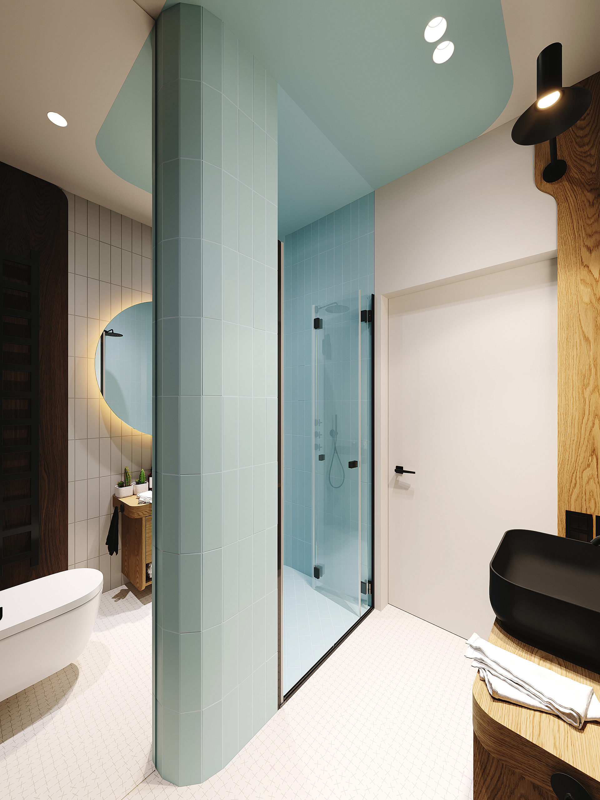 Bold color combinations in free forms and shapes, combined with a multitude of precisely designed details, completely transform the perception of dark wood structures, rounded edges harking back to the 60s, and stone countertops. The bedrooms were designed in a similar spirit and are a kind of festival of forms and colors, but in a very geometric and stylistic regime, creating a super refreshing atmosphere of stylistic revelry.